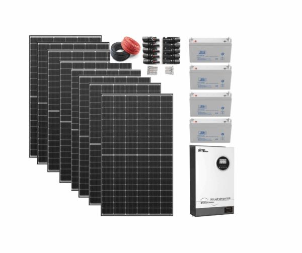 pachet 5kw ,9 panouri 540 canadian solar hiku6 invertor 5,2 kw hybird pro, 4 acumlatori 120a, mufe mc4 si cabluri 20mx4mm