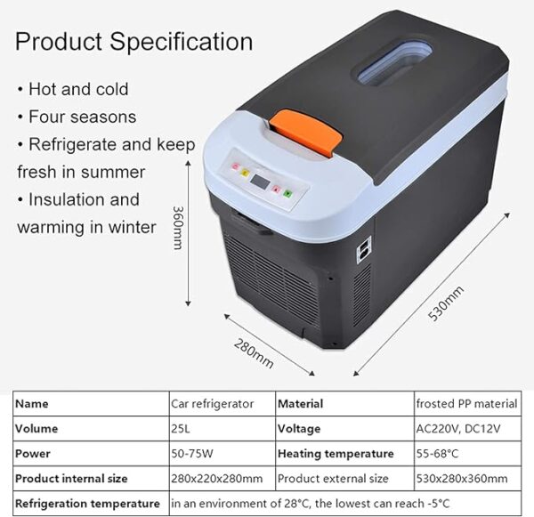 Whether you need cooling or heating, for home use or outdoors, this is always your helper. Put anything you want in this 25L mini-fridge. Equipped with a detachable shelf, you can assemble it as you like, and its capacity exceeds your imagination. The advanced thermoelectric system can cool up to 25°C below ambient temperature or 55–65°C at high temperature. Keep your drinks cold and your food warm at the press of a switch! Feature Quiet and low noise The running sound of the fridge is about 39 decibels, the noise is lower than similar products, and it is quiet and eco-friendly. Specifications Name: Car refrigerator Operating voltage: AC220V/DC12V Power: 50–75W Material: ABS + polyurethane (PU) hydration layer Refrigeration temperature: about 28°C lower than ambient temperature, the lowest can be up to -5°C Heating temperature: 55–68°C Product internal size: 280x220x280 mm Product external size: 530x280x360 mm Single package weight : 6.5 kg